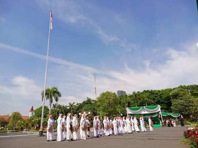 Sejak pagi suasana khidmat sudah terlihat di halaman Taman Surya Balai Kota. Ratusan santri terus bergantian datang memasuki halaman tempat upacara digelar.