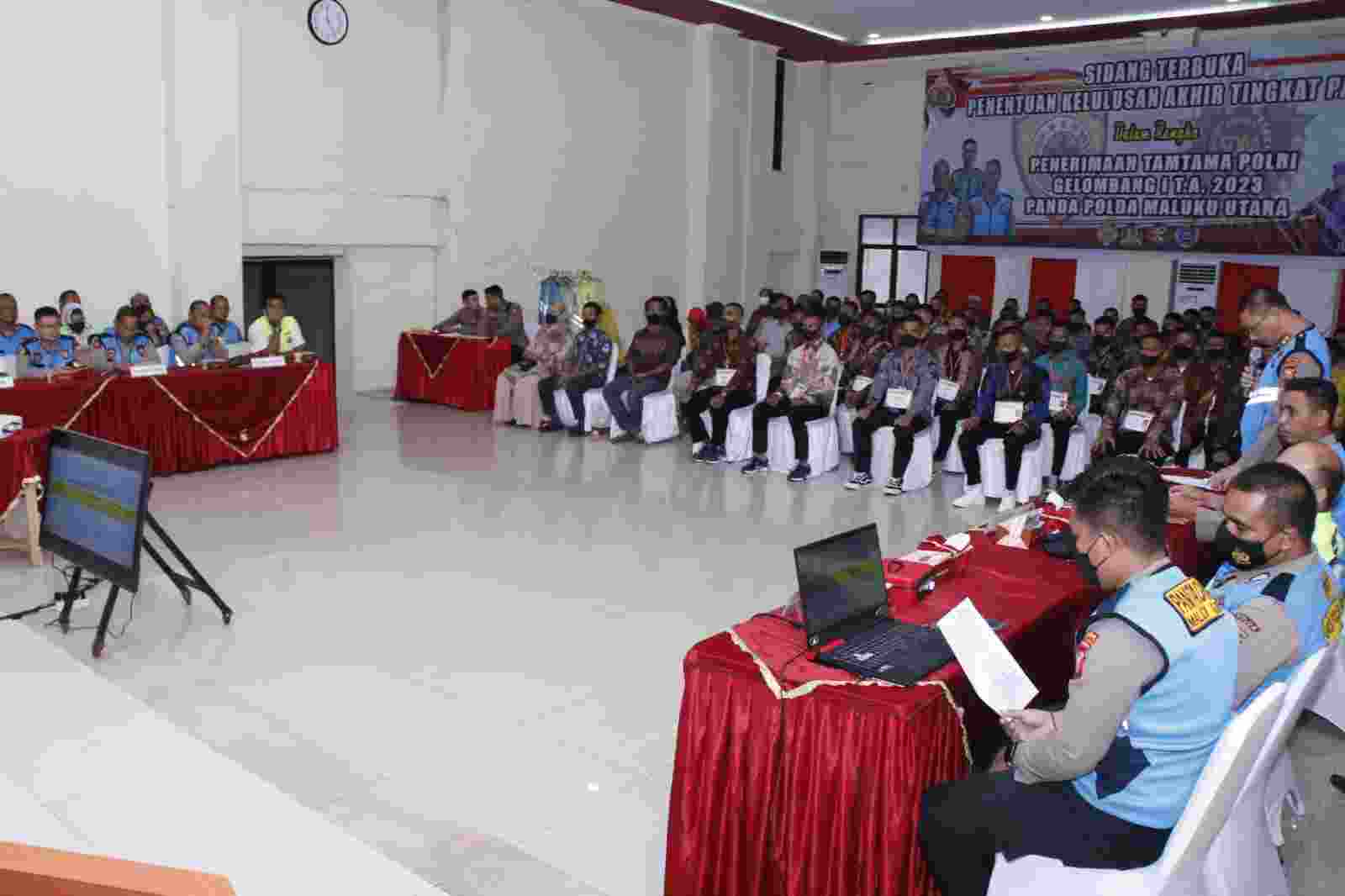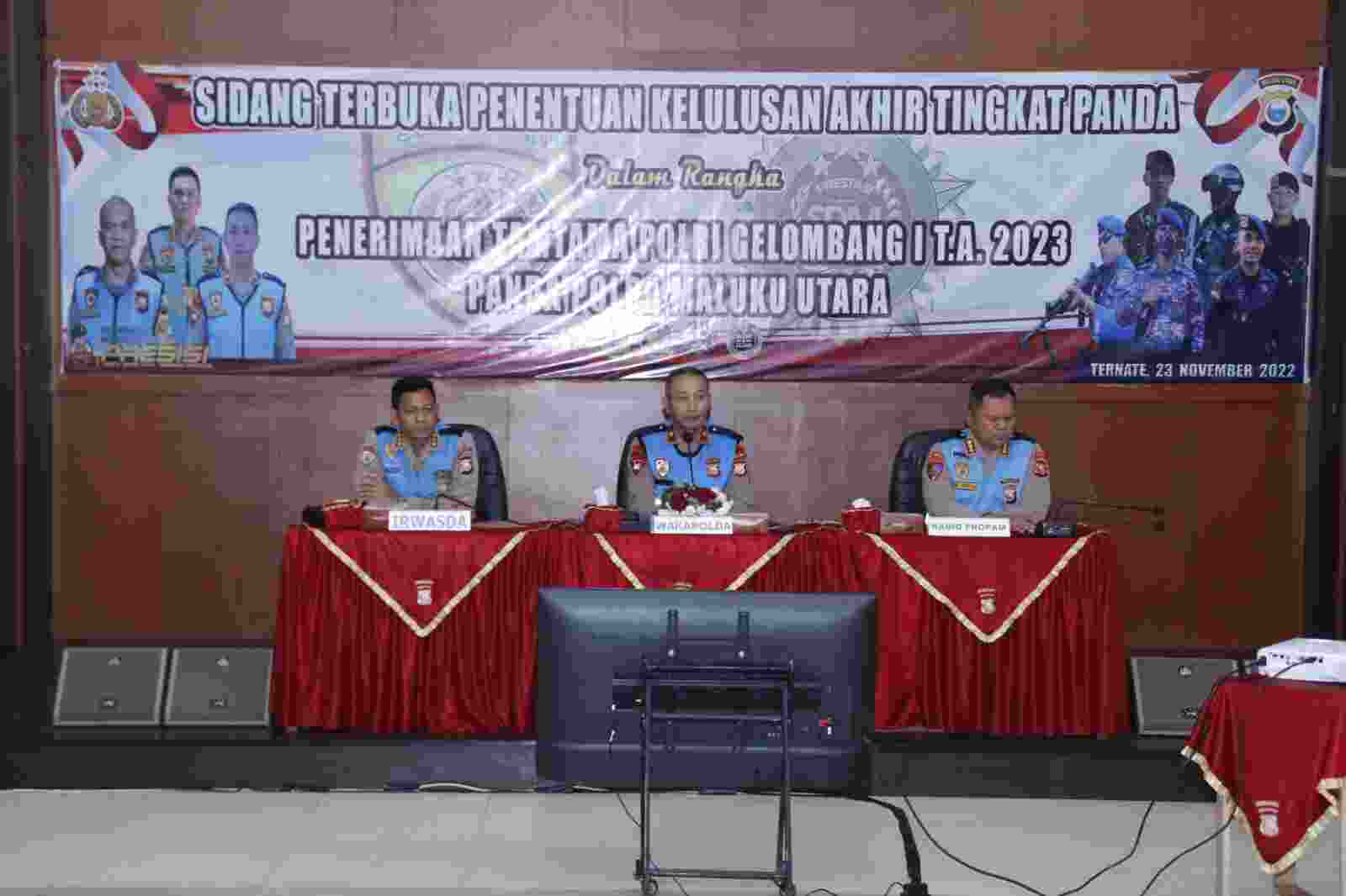 TERNATE, detikgo.com – Biro SDM Polda Maluku Utara menggelar sidang penentuan kelulusan akhir Tingkat Panda dalam rangka penerimaan Tamtama Polri Gelombang I TA 2023 Panda Polda Malut yang bertempat di Aula Kie Raha Polda Malut, Rabu (23/11/2022).