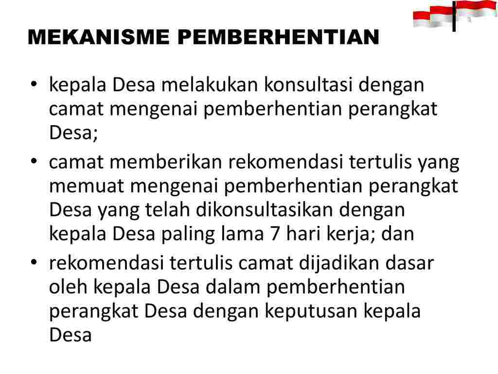Lebih lanjut dikatakan bahwa pemberhentian tanpa menghormati mekanisme perundang-undangan yang berlaku adalah bentuk pelanggaran hukum. “Meskipun Kepala Desa memiliki kewenangan mengangkat dan memberhentikan perangkat desa, tetapi tidak sembarang mengganti perangkat desa tanpa didasari aturan seperti memenuhi unsur yang tertuang dalam peraturan tentang pengangkatan dan pemberhentian perangkat desa” jelasnya sambil menambahkan bahwa jika mengacu pada Peraturan Menteri Dalam Negeri maka Perangkat Desa bisa diganti apabila meninggal dunia, mengundurkan diri, terjerat kasus amoral dan tidak cukup umur.
